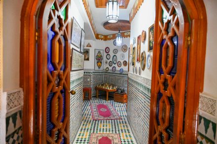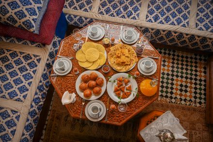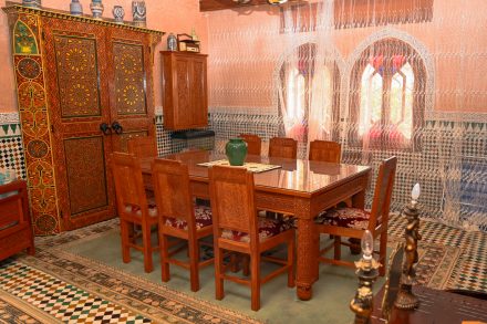 Déjeuner et dîner sur commande préalable : cuisine marocaine fassie, menu ou à la carte, hors boissons – 30 € par repas.