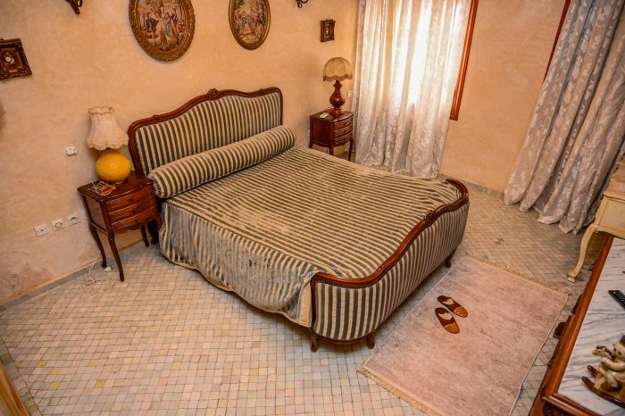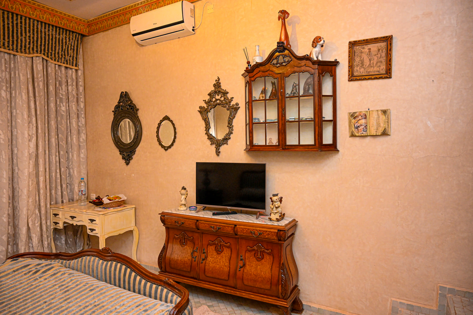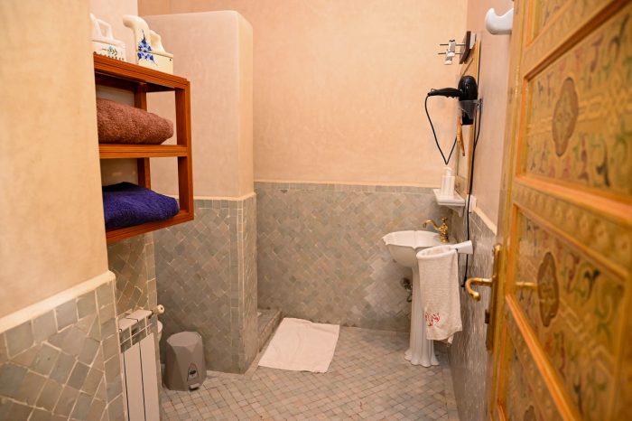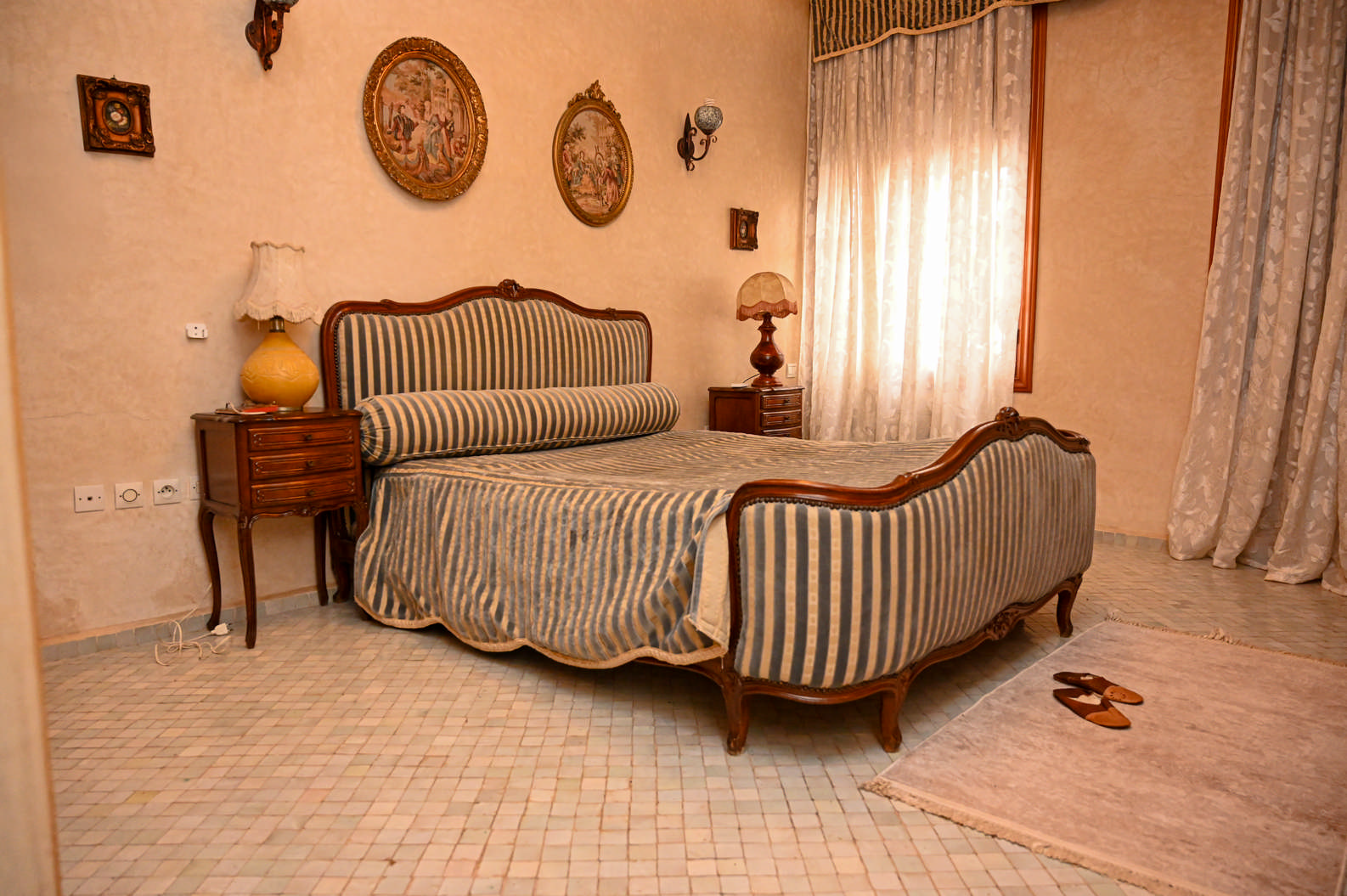 La décoration marocaine, fine et maîtrisée, s’intègre avec discrétion pour souligner le caractère apaisant de la chambre. Les matières choisies et l’agencement soigné favorisent le confort et la sérénité.