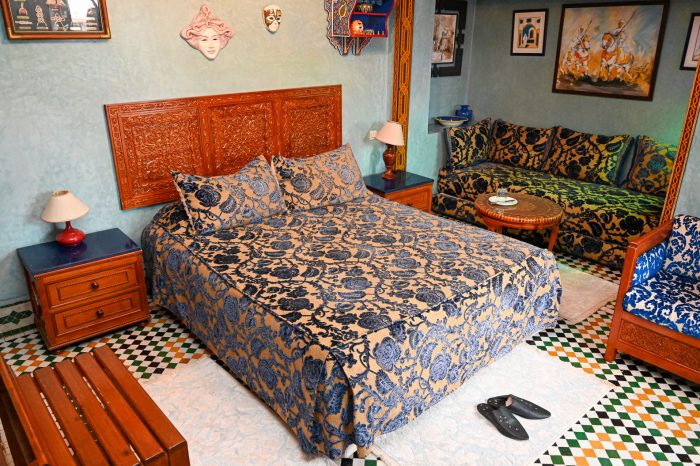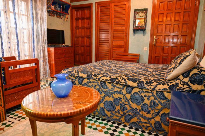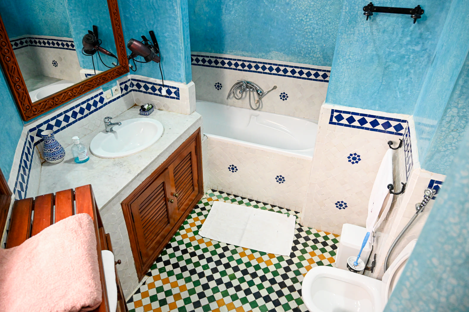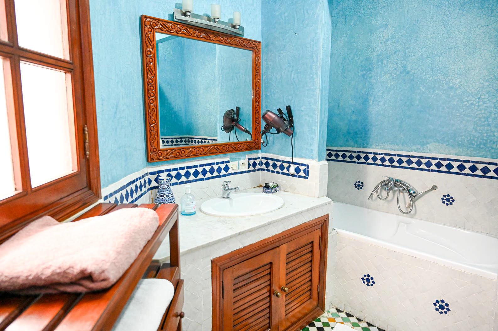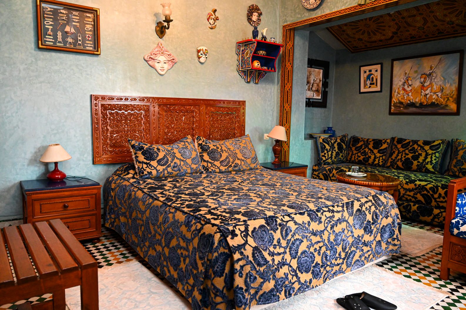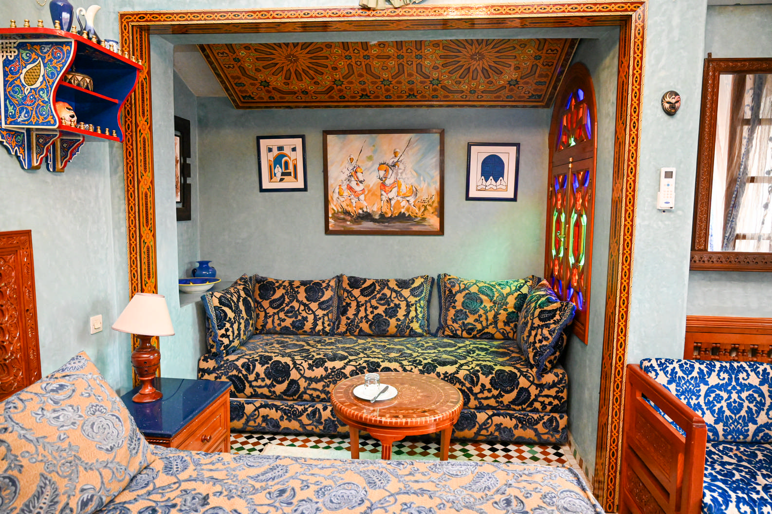 Spacieuse et lumineuse, la suite associe une décoration marocaine élégante à un aménagement harmonieux. Le coin salon offre un espace confortable pour se relaxer, dans un cadre calme et équilibré.
